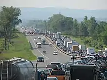 From Highway 401 to the Holland Marsh the freeway largely parallels the arterial/concession roads Weston Road and Jane Street, passing over the height of land at the Oak Ridges Moraine.[9] The highway passes through protected rural areas in northern York Region and encounters rolling countryside in Simcoe County south of Barrie.[8] Between Major Mackenzie Drive and King Road, Highway 400 features HOV lanes which have acceleration/deceleration lanes at entry/exit points.[10] Just a bit north of the Simcoe Road 88 exit, Highway 400 will meet the future Bradford Bypass. The section near Barrie is subject to snowsqualls as it lies near the edge of Georgian Bay's snowbelt.