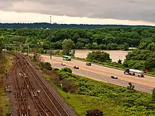 East of Ancaster, the freeway passes through a short greenbelt, with Hamilton Golf and Country Club lying to the north. A divided segment of Highway 6 meets the freeway and continues concurrently with it through Hamilton; to the south, Highway 6 travels to Hamilton International Airport, Caledonia, and Jarvis at Highway 3.[4] Continuing east, Highway 403 and Highway 6 curve north into Hamilton and meet the Lincoln M. Alexander Parkway before abruptly turning to the east and descending the Niagara Escarpment. Scenic views of Hamilton, its harbour, port and Lower Princess Falls are along this steep descent. At the bottom of the escarpment the highway travels through a narrow, heavily developed corridor alongside former Highway 8. It passes beneath multiple bridges in a depressed trench, eventually curving north at a sharp corner and passing beneath more bridges.[4] This section features a reduced speed limit of 90 km/h (56 mph) as opposed to 100 km/h (62 mph).[6] The highway returns to ground level alongside the Chedoke Creek, a now-channelized river from which the freeway may take its name.[7]