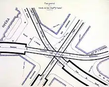 The Line 3 platforms opened on 19 October 1904 as part of the first section of the line opened between Père Lachaise and Villiers. A twenty metre high masonry well was built to avoid the need for heavy underpinning work when Line 7 and Line 8 were planned to be built. This work was affected by groundwater, which required the support of three concrete pillars, made by sinking caissons with workers digging out the mud with compressed air. The work lasted eleven months, from March 1903 to February 1904.[1] It owes its name to the Garnier opera house, built by the architect Charles Garnier.