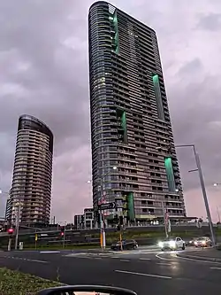 Opal Tower is a residential tower located in the suburb of Sydney Olympic Park in the Australian state of New South Wales. It was completed in August 2018. The high-rise residential tower was built by Icon, developed by Ecove and designed by Bates Smart Architects.[2] The building has 392 apartments, with 34 above ground levels and three levels underground.[3][4] On 24 December 2018 residents had reported loud banging noises, exposed panelling and cracks which mainly affected levels four and 10.[5] All residents were evacuated from the building and relocated to Airbnb and hotel accommodation over the Christmas and New Year holiday period.[5]
