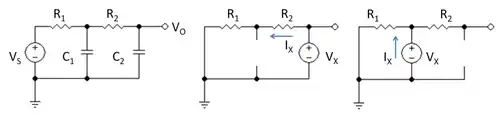 - Select capacitor C2, replace it by a test voltage VX, and replace C1 by an open circuit. Then the resistance seen by the test voltage is found using the circuit in the middle panel of Figure 1 and is simply VX / IX = R1 + R2. Form the product C2 ( R1 + R2 ).