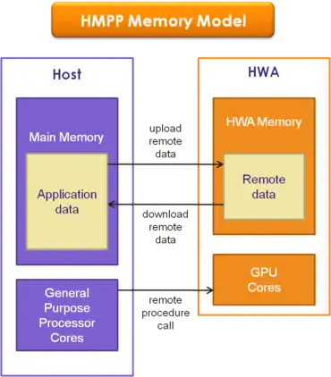 HMPP considers two address spaces: the host processor one and the HWA memory.