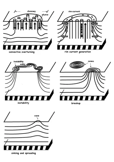 Ocean convection is distinguished by three phases: preconditioning, deep convection and lateral exchange and spreading. Preconditioning is referred to a period during which a cyclonic gyre-scale circulation and buoyancy forcing are combined to predispose a convective site to locally overturn. A site is preconditioned when a laterally extended deep region of relatively weak vertical density stratification exists there, and it is capped by a locally shallow thermocline. Cooling events lead to the second phase, deep convection, in which a part of the fluid column may overturn in numerous plumes that distribute the dense surface water in the vertical axis. These plumes form a homogeneous deep chimney. During this phase, the chimney is getting deeper through plume-scale overturning and adjusts geostrophically. Additionally, at some point in time, the sea-surface buoyancy loss is completely offset through lateral buoyancy transfer by baroclinic eddies which are generated at the periphery of the convective regime and thus, the quasi-steady state can be achieved. Once the surface forcing decreases, the vertical heat transfer due to convection abates, leading to horizontal transfer associated with eddying on geostrophic scale. The balance between sea-surface forcing and lateral eddy buoyancy flux becomes unstable. Due to gravity and planetary rotation, the mixed fluid disperses and spreads out, leading to the decay of the chimney. The residual pieces of the “broken” chimney are named cones. The lateral exchange and spreading are also known as restratification phase. If surface conditions deteriorate again, deep convection can reinitiate while the remaining cones can form preferential centers for further deep convective activity.[3][9][10]