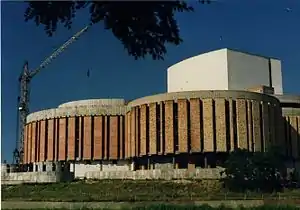 Although works were expected to end in 1982, the economic crisis of the 1980s reduced severely state funds allocated for culture, interrupting the construction. Building became a symbol of "eternal investments" and few people believed in its completion. It is only in 1985, thanks to an increased effort of provincial administrative authorities and cultural lobbies, that the continuation of the construction was insured through the National Culture Development Fund. In 1986, former military warehouses and Headquarters Garrison were at last demolished, getting the work accelerated. Between 1990 and 1994, the main body of the edifice housing the auditorium and the main stage was glazed, and the work moved to dressing rooms and rehearsal rooms, all of which was carried out by a specialized Company, "Teatr" from Warsaw.[11] With the end of communist era, the Fund for the Development of Culture was liquidated, putting another threat to postpone the completion of the building. Construction was then focusing on the third circle, planned to host offices (TVP3 Bydgoszcz), a convention center and restaurants. Around this date, initiative was taken to use the raw building to organize the first Bydgoszcz Opera Festival: main points were to draw attention of the public and decision makers on this important project and to raise funds for its achievement.[8]