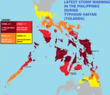 Shortly before Haiyan entered the Philippine Area of Responsibility on November 6, PAGASA raised Public Storm Warning Signal (PSWS) No.1, the lowest of four levels, for much of the Visayas and Mindanao.[34] As the storm continued to approach the country, warnings expanded into Luzon and increased in severity for eastern areas.[35] By the evening of November 7, PSWS No. 4, the highest level of warning which indicates winds in excess of 185 km/h (115 mph) are expected, was raised for Biliran Island, Eastern Samar, Leyte, Northern Cebu, Metro Cebu, Samar, and Southern Leyte.[36][37] Through November 8, the coverage of PSWS No. 4 continued to expand, with areas in southern Luzon being included.[38]