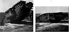 The Belgian architect who had designed the wall was a refugee in France and supplied his drawings. A replica was built at Merlimont and a detachment of tanks under Major Bingham rehearsed on it, using "shoes" on the tank tracks and special detachable steel ramps carried by the tanks, until they could climb the wall.[6] In experiments on the Thames Estuary, the pontoons performed exceptionally well, riding out very bad weather and being easier to manoeuvre than expected, leading to hopes that they could be used again after the initial assault to land reinforcements.[7] Night landings were also practised, with wire stretched between buoys to guide the pontoons to within 100 yd (91 m) of their landing place.[5]