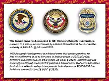 - "ICE, international law enforcement agencies seize 706 domain names selling counterfeit merchandise" (Press release). U.S. Immigration and Customs Enforcement. U.S. Immigration and Customs Enforcement. 2013-12-02. Retrieved 2014-03-01.