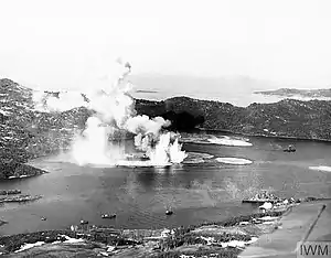 ![]() Operation Judgement. The main targets of the attack, the depot ship Black Watch and U-711 are hidden behind water columns and smoke | |||||||