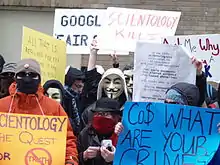 On January 21, 2008, individuals claiming to speak for Anonymous announced their goals and intentions via a video posted to YouTube entitled "Message to Scientology" and a press release declaring a "War on Scientology" against both the Church of Scientology and the Religious Technology Center.[15][17][18] In the press release, the group states that the attacks against the Church of Scientology will continue in order to protect the right to freedom of speech and end what they believe to be the financial exploitation of church members.[19] A new video "Call to Action" appeared on YouTube on January 28, 2008, calling for protests outside Church of Scientology centers on February 10, 2008.[20][21] On February 2, 2008, 150 people gathered outside of a Church of Scientology center in Orlando, Florida to protest the organization's practices.[22][23][24][25] Small protests were also held in Santa Barbara, California,[26] and Manchester, England.[23][27] On February 10, 2008, about 7000 people protested in more than 93 cities worldwide.[28][29] Many protesters wore masks, or otherwise disguised their identities, in part to protect themselves from reprisals from the Church.[30][31]