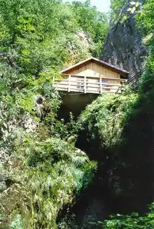 About 11:15, after Rybka's first attack had been defeated, Tito and the small group gathered with him escaped from the cave.[48] There was a platform at the mouth of the cave, and they climbed down a rope through a trapdoor in the platform, although the panic displayed by Tito's mistress Davorjanka Paunović (codenamed "Zdenka") and his dog Tigar caused some delays. The party split up and following a creek leading away from the Unac, the small groups climbed the heights to the east and withdrew toward the village of Potoci.[24]