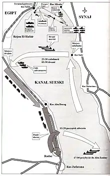 "Pinko" Harel's small force of about a hundred men, six Tiran 5s and three BTR-50s, landed on the Egyptian coast at 03:37AM on the morning of September 9. Delivered by three landing craft to a beachhead secured by Shayetet 13, Harel's force landed at El Hafair, 40 kilometres (25 mi) south of Suez and 20 kilometres (12 mi) south of the anchorage at Ras Sadat.[11] Laden with extra fuel and ammunition, the force headed south, wreaking havoc behind Egyptian lines and attacking installations along the way. The first of these was the Egyptian Army camp and radar site at Abu Darag, which by 07:17 had been secured.[1][5]