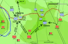 The 272nd Infantry Division was reinforced by the reconnaissance battalion of 10th SS Panzer Division, an infantry battalion from the 9th SS Panzer Division, an armoured Kampfgruppe from the 2nd Panzer Division as its divisional reserve and counter-attack force and the 501st Heavy Panzer Battalion with Tiger Is and King Tigers. The left (east) flank was protected by 10th SS Panzer Division and 102nd SS Heavy Panzer Battalion with Tiger Is, firing from the high ground west of the Orne. The operational reserve for 1st SS Panzer Korps was 9th SS Panzer Division which had two Kampfgruppen south of Verrières directly behind the 272nd Infantry Division and the 1st SS Panzer Division. Available under OKW control was the 116th Panzer Division, assembling east of Cramesnil and the remainder of the 2nd Panzer Division, south of May-sur-Orne, astride the Orne.[7] British Y service signals interception units discovered on 21 July that parts of the 2nd Panzer Division, the 9th SS Panzer Division and the 10th SS Panzer Division had been sent east of the Orne but the rest of the recent German moves were not known.[6][8]