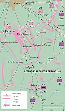 Operation Totalize (also spelled Operation Totalise in recent British sources) was an offensive launched by Allied troops in the First Canadian Army during the later stages of Operation Overlord, from 8 to 9 August 1944.[6] The intention was to break through the German defences south of Caen on the eastern flank of the Allied positions in Normandy and exploit success by driving south, to capture the high ground north of the city of Falaise. The goal was to collapse the German front and cut off the retreat of German forces fighting the Allied armies further west. The battle is considered the inaugural operation of the First Canadian Army, which had been activated on 23 July.[7]