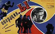 Operation Y and Shurik's Other Adventures (Russian: Операция «Ы» и другие приключения Шурика) is a 1965 Soviet slapstick comedy film directed by Leonid Gaidai, starring Aleksandr Demyanenko, Natalya Seleznyova, Yuri Nikulin, Georgy Vitsin and Yevgeny Morgunov. The film consists of three independent parts: "Workmate" (Напарник, Naparnik), "Déjà vu" (Наваждение, Navazhdeniye) and "Operation Y"[1] (Операция «Ы»).[2][3] The plot follows the adventures of Shurik, the naive and nerdy Soviet student who often gets into ludicrous situations, but always finds a way out very neatly.
