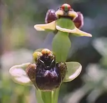 Ophrys bombyliflora is pollinated by males of solitary bees of the genus Eucera (which are not bumblebees).[2] As with other species of Ophrys, the flowers mimic the females in appearance and scent. Earlier-emerging males attempt to mate with the flowers ("pseudocopulation"), collecting pollinia in the process which they transfer to other flowers of the same species.[3]