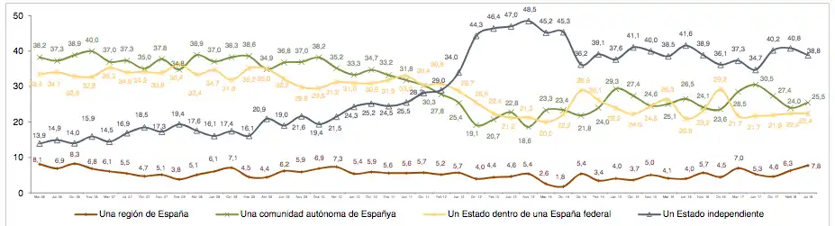 | Date | Independent state (%) | Federal state within Spain (%) | Autonomous community within Spain (%) | Region within Spain (%) | Do not know (%) | Did not reply (%) |