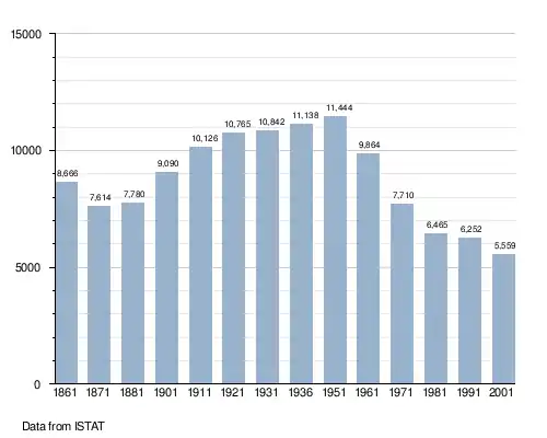 The population halved during the last century. Many inhabitants moved to the industrial centres in northern Italy or joined the Italian diaspora to escape the extreme poverty.[3]