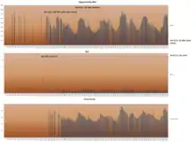 A series of cleaning events beginning on Sol 1149 (April 20, 2007) allowed Opportunity's solar energy production to rise to above 800 watt-hours per Sol. By Sol 1163 (May 4, 2007) the solar array current was peaking above 4.0 amperes, values not seen since Sol 16 (February 10, 2004).[33] However, the advent of extensive dust storms on Mars starting in mid-2007 (in-line with Mars' six Earth-year global dust storm cycle), dropped energy production levels to 280 watt-hours per day.[34]