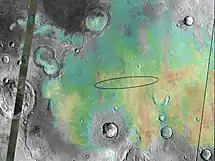 Opportunity landed in Meridiani Planum at 1.95°S 354.47°E, about 25 kilometers (16 mi) downrange (east) of its intended target on January 25, 2004, at 05:05.[4] Although Meridiani is a flat plain, without the rock fields seen at previous Mars landing sites, Opportunity rolled into an impact crater 22 meters in diameter, with the rim of the crater approximately 10 meters (33 ft) from the rover.[4] NASA Scientists were so excited about landing in a crater that they called the landing a "hole in one"; however, they were not aiming for the crater (and did not know it existed). Later, the crater was named Eagle crater and the landing site designated "Challenger Memorial Station".[5] This was the darkest landing site ever visited by a spacecraft on Mars. It would be two weeks before Opportunity was able to get a better look at its surroundings.