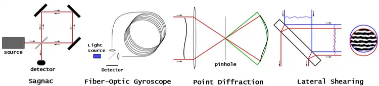 A common-path interferometer is a class of interferometer in which the reference beam and sample beam travel along the same path. Fig. 4 illustrates the Sagnac interferometer, the fibre optic gyroscope, the point diffraction interferometer, and the lateral shearing interferometer. Other examples of common path interferometer include the Zernike phase-contrast microscope, Fresnel's biprism, the zero-area Sagnac, and the scatterplate interferometer.[7]