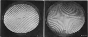 Newton (test plate) interferometry is frequently used in the optical industry for testing the quality of surfaces as they are being shaped and figured. Fig. 13 shows photos of reference flats being used to check two test flats at different stages of completion, showing the different patterns of interference fringes. The reference flats are resting with their bottom surfaces in contact with the test flats, and they are illuminated by a monochromatic light source. The light waves reflected from both surfaces interfere, resulting in a pattern of bright and dark bands. The surface in the left photo is nearly flat, indicated by a pattern of straight parallel interference fringes at equal intervals. The surface in the right photo is uneven, resulting in a pattern of curved fringes. Each pair of adjacent fringes represents a difference in surface elevation of half a wavelength of the light used, so differences in elevation can be measured by counting the fringes. The flatness of the surfaces can be measured to millionths of an inch by this method. To determine whether the surface being tested is concave or convex with respect to the reference optical flat, any of several procedures may be adopted. One can observe how the fringes are displaced when one presses gently on the top flat. If one observes the fringes in white light, the sequence of colors becomes familiar with experience and aids in interpretation. Finally one may compare the appearance of the fringes as one moves ones head from a normal to an oblique viewing position.[51] These sorts of maneuvers, while common in the optical shop, are not suitable in a formal testing environment. When the flats are ready for sale, they will typically be mounted in a Fizeau interferometer for formal testing and certification.