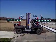 - Wave-off lights – red flashing lamps which, when lit, indicate that the pilot must add full power and go around – a mandatory command. When the wave-off lights are lit, all other lamps are extinguished. The wave-off lights are operated manually by the LSO.