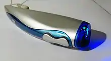 A laser mouse uses an infrared laser diode instead of an LED to illuminate the surface beneath their sensor. As early as 1998, Sun Microsystems provided a laser mouse with their Sun SPARCstation servers and workstations.[18] However, laser mice did not enter the mainstream consumer market until 2004, following the development by a team at Agilent Laboratories, Palo Alto, led by Doug Baney of a laser-based mouse based on a 850 nm VCSEL that offered a 20X improvement in tracking performance. Tong Xie, Marshall T. Depue, and Douglas M. Baney were awarded US patents 7,116,427 and 7,321,359 for their work on low power consumption broad navigability VCSEL-based consumer mice. Paul Machin at Logitech, in partnership with Agilent Technologies introduced the new technology as the MX 1000 laser mouse. This mouse uses a small infrared laser (VCSEL) instead of an LED and significantly increased the resolution of the image taken by the mouse. The laser illumination enabled superior surface tracking compared to LED-illuminated optical mice.[19]