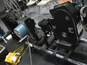 An optical printer is a device consisting of one or more film projectors mechanically linked to a movie camera. It allows filmmakers to re-photograph one or more strips of film. The optical printer is used for making special effects for motion pictures, or for copying and restoring film material.[1]