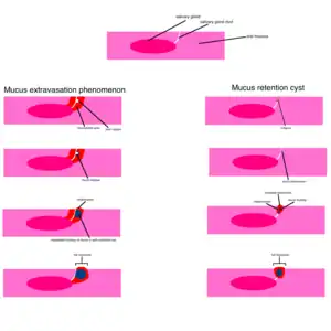 Oral mucocele (also mucous extravasation cyst, mucous cyst of the oral mucosa,[1] and mucous retention and extravasation phenomena.) is a condition caused by two related phenomena - mucus extravasation phenomenon and mucous retention cyst.
