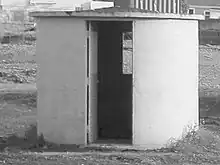The side photograph includes the two hundred or so unique concrete sheds built around 1947 in the vicinity of Oranga, Onehunga, Auckland. While their blueprints are possibly lost to time we know they were constructed of a base, cylinder, and roof using wood forms that will have been reused to begin the build process anew after each pouring, also their parts may have been built off-site and then assembled on location. The ceiling view had the appearance of the form being constructed like a cheese segment style rotation that was then poured and mounted atop with a slight overhang or eave around the outside. A single circular indent system was used to hold the roof in place atop the cylinder. These handy out-buildings featured a door and window opposite (upper four louvre with lower pane), with a small drainage hole at the floor wall corner below, while above outside the roof had a designed-in circular shallow v-gutter around the outer edge making for simple rain channeling with a drainage dip off to one side for water run-off. The roof could not be walked upon as the studfinder shows little or no reinforcing. The interior walls had around six vertical equally spaced planks attached for holding tools. The walls were around two and a half inches thick for the cylinder, and three inches for the roof section, and three for the base which sat in-line with the cylinder, Their large internal space measuring eight feet across the floor and seven feet to the apex above meant they could be used as a place for storage and or dispatching fowl back in the day. Slight banding and nail head indents can be seen around the exterior and interior walls where the wood forms had been erected for pouring day. The exterior was given a simple white coating.