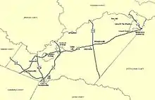 Orange County prospered with the development of several railroad routes through Orange and Gordonsville in the 1840s and 1850s. They succeeded the plank road between Fredericksburg and Orange, which connected with two important roads: the Richmond Road between the state capital and the Shenandoah Valley (which passed through Louisa) and a stagecoach route to Charlottesville and points south. The Orange and Alexandria Railroad and Virginia Central Railroad helped foster a diversified agricultural economy in Orange County, bringing produce and timber to markets in Richmond, Washington D.C., and Norfolk as well as more industrial products. The final adjustment of the county's boundaries occurred in 1838 when Greene County was created from the western portion of Orange. The Town of Orange was legally established in 1834 (officially becoming a town in 1872) and had already served as the county seat for nearly a century; Gordonsville officially achieved town status in 1870.[7]