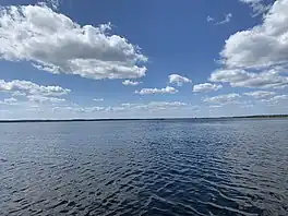 Orange Lake is in Alachua County, Florida, about 10 miles (16 km) south of Hawthorne. It has an area of about 12,550 acres (5,080 ha), and is part of the Orange Creek Basin, which is in turn part of the Oklawaha River watershed. Cross Creek flows into it from Lochloosa Lake, and Orange Creek drains it into the Rodman Reservoir. Orange Lake also receives water from Newnans Lake that has been diverted from its historic destination of Paynes Prairie. Orange Lake is noted for fishing, especially bass, with many fishing camps on its shores. The lake also has many natural floating islands, which have an "unusually high diversity", especially of amphibians.[1][2]