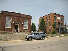 The first commercial brick building to be constructed in the main business district was the Central House, which operated as a hotel from its construction during the 1860s until its conversion to a single family residence in the 1930s. All other buildings were erected around Central House, which was specifically located and designed to be the center piece of downtown Orangeville.[5] The People's State Bank was the last major commercial building constructed in historic downtown Orangeville.[7] In 1932 People's State Bank closed its doors. In 1956 Community Bank of Orangeville opened for business in the downtown area. In 1980 Community Bank moved to the current church street location on the south end of town. Community Bank of Orangeville is the village's only operating bank.