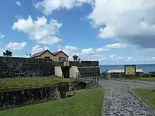The main historical site in Oranjestad is Fort Oranje, a well-maintained, 17th-century fort in the direct centre of the town, overlooking the waterfront. This cliff-side fort has cannons, intact bastions and a courtyard. Nearby is a museum, the ruins of one of the oldest synagogues in the Western Hemisphere, and a Jewish cemetery.[8]