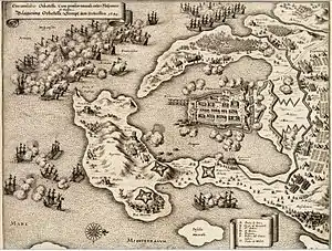 The town was besieged by the French during the 1635-1659 Franco-Spanish War. This led to the inconclusive naval Battle of Orbetello on 14 June; in July, a Spanish army forced the French to lift the siege.[4]
