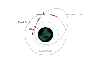 - Using low thrust engines (such as electrical propulsion), if the initial orbit is supersynchronous to the final desired circular orbit then the optimal transfer orbit is achieved by thrusting continuously in the direction of the velocity at apogee. This method however takes much longer due to the low thrust.[6]