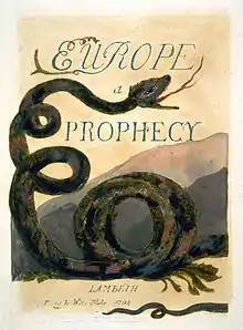 In America a Prophecy (1793), Orc is described as a threat to the British colonies in America and to society. The angel of Albion sees Orc as an antichrist figure, and Orc views the prince of Albion as a dragon. During the work, Orc has an apocalyptic vision where the empire is destroyed and the oppressors of the world are stopped. Following the vision, Orc is able to get the Americans to rise up in revolution and they begin to attack their oppressors through a mental revolution.[10] In Europe a Prophecy (1794), Orc is connected to the revolution in France but it is Los who calls the people to revolution.[11] In The Song of Los, Orc provokes thought within the second half, "Asia", which unsettles the kings of earth, and Orc is described as raging across Europe.[12] In these continental works, Los and Orc are seen as describing an apocalypse that would result in freedom.[13]