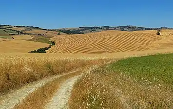 The Val d'Orcia or Valdorcia (Italian pronunciation: [ˌvalˈdortʃa]) is a region of Tuscany, central Italy, which extends from the hills south of Siena to Monte Amiata. Its gentle, cultivated hills are occasionally broken by gullies and by picturesque towns and villages such as Pienza (rebuilt as an "ideal town" in the 15th century under the patronage of Pope Pius II),[1] Radicofani (home to the notorious brigand-hero Ghino di Tacco) and Montalcino (the Brunello di Montalcino is counted among the most prestigious of Italian wines).[2] Its landscape has been depicted in works of art from Renaissance painting to modern photography.