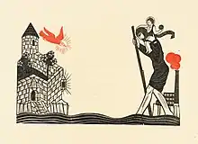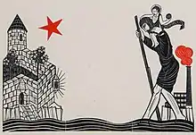 Recipients were also given a monetary prize, and an Eric Gill designed certificate, depicting Saint Christopher, in front of a smoking chimney, carrying the Christ Child across water, towards a walled garden ("A Rose Plant in Jericho"[5]) with a red star overhead,[6][7][8] Certificates for individual men were inscribed:[9]