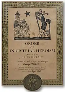 The Order was instituted in 1923[1][2] by the Daily Herald specifically to recognise the deeds of valour of those who had saved their fellow workers from danger or death. It was popularly known as the "Workers' VC".[3]