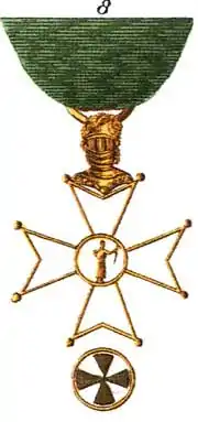 In 1801, 'Sir' Levett Hanson[6] wrote to Admiral Lord Horatio Nelson offering him membership of the order to recognize his victory at the Battle of the Nile. Following the review and approval of the English College of Arms, the King's Warrant approving the acceptance and wear of the insignia of the Order of Saint Joachim was granted.[7] Nelson was wearing the breast cross of the Order of Saint Joachim at the Battle of Trafalgar and is still seen on the famous "Trafalgar coat" in the National Maritime Museum in Greenwich, UK. Several other Englishmen later received the King's Warrant to accept the Order of Saint Joachim, including Nelson's brother, Viscount Merton, General Sir Charles Imhoff,[8] and Philippe d'Auvergne, Prince de Boullion, Rear Admiral of the Blue.[9] In 1802, Hanson published An Accurate Historical Account of all the Orders of Knighthood at present existing in Europe casting the Order of Saint Joachim as equal to existing chivalric orders and dedicating the work to Nelson.[10]