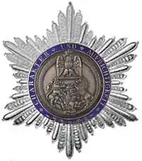 The Order of the Crown of Westphalia (German: Orden der Westfälischen Krone) was instituted in Paris on 25 December 1809 by King Hieronymus I of Westphalen, better known as Napoleon's brother Jérôme Bonaparte. The motto of the Order was "CHARACTER UND AUFRICHTIGKEIT" (Character and honesty). At the back stood the words "ERRICHTET DEN XXV DEZEMBER MDCCCIX".