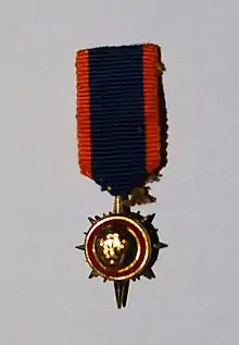 The Miniature Badge of the Order is a miniature of the Badge measuring 20mm in diameter and is worn as a miniature medal pendant from a miniature of the riband measuring 15mm wide.