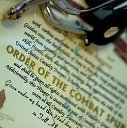 The Order of the Spur is a Cavalry tradition within the United States Army. Soldiers serving with Cavalry units (referred to as "Troopers") are inducted into the Order of the Spur after successfully completing a "Spur Ride" or for having served during combat as a member of or with a Cavalry unit. A trooper who has earned both Silver and Gold spurs is known as a "Master Spur Holder." Traditionally, each Trooper is presented spurs by his sponsor at a ceremonial dining in commonly referred to as the "Spur Dinner". The spurs are to be worn with the military uniform during Squadron or Regimental ceremonies and events or as designated by the Cavalry unit commander. In some units, gold spurs are awarded for combat inductions while silver spurs represent having completed the Spur Ride. Within the tradition, silver spurs and gold spurs hold a similar relationship for the cavalry as the Expert Infantryman Badge hold in the U.S. Army Infantry, as well as the Expert Field Medical Badge and the Combat Medical Badge hold to U.S. Army Medics. There is no Military Occupational Specialty (MOS) requirement for the Order of the Spur and the order is open to members of foreign militaries serving with U.S. Cavalry units.