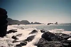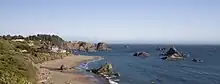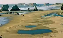 The Oregon Coast is divided into three different regions based on their geological formations: the North Coast, Central Coast, and South Coast. Three primary landforms appear along its shoreline: sea cliffs, beaches, and stacks.[6] Minor land variation, city size, and socioeconomic differences between the North and Central regions cause division between them to be made along geological lines.[6]