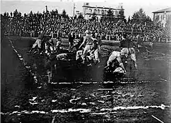 As had its predecessor, Kincaid Field suffered from chronically poor drainage. Workers constantly battled the elements to provide a field suitable for play; at least one football was lost in the mud during a game.[9] Oregon Agricultural College's student news reporter described Kincaid during the 1915 game as "a cross between a duck pond and a hog wallow"; the Eugene Guard's correspondent said "The field was a sea of mud, not deep, but wet and slippery. Rain fell throughout every minute of the game, and time and again every player was standing to his ankles in water."[10]