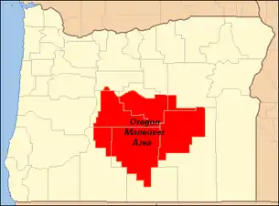 The maneuver extended across parts of seven eastern Oregon counties, a total of over 10,000 square miles (26,000 km2). Almost all of Deschutes County was included in the maneuver area along with large parts of Crook, Harney, Klamath, and Lake counties. Small portions of Jefferson and Grant counties were also included in the maneuver area. The area included parts of four national forests, the Deschutes National Forest in the west, the Fremont National Forest in the southwest, the Ochoco National Forest in the north and the Malheur National Forest in the northeast plus vast tracts of land administered by the Bureau of Land Management throughout the maneuver area. The maneuver area was an irregular triangle shape, with Sisters in the northwest corner, Burns in the northeast corner, and Valley Falls in the south.[1][4][5]