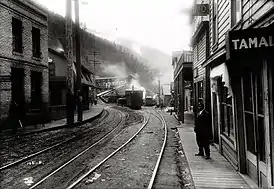 The company purchased right-of-way in 1882 from Alfred B. Meacham and John Harvey Meacham, along their Meacham Road through the Blue Mountains.[1] The Meacham road, built in 1862, had a lower pass (4,185 feet (1,276 m)) than competing roads, and was a corduroy road, allowing it to hold up in poor weather conditions.[1] The railroad was laid in 1884.[1]