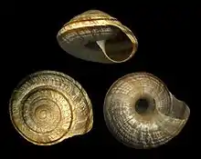 | Three views of a shell of Oreohelix subrudis | |