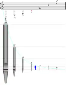 The lowest pipes in a rank are long, and the highest are short. The progression of the length of pipes is dictated by physics alone, and the length must halve for each octave. Since there are twelve semitones in an octave, each pipe differs from its neighbours by a factor of . If the diameters of the pipes are scaled in the same way, so each pipe has exactly the same proportions, it is found that the perceived timbre and volume vary greatly between the low notes and the high, and the result is not musically satisfactory. This effect has been known since antiquity, and part of the organ builder's art is to scale pipes such that the timbre and volume of a rank vary little, or only according to the wishes of the builder. One of the first authors to publish data on the scaling of organ pipes was Dom Bédos de Celles. The basis of his scale was unknown until Mahrenholz discovered that the scale was based on one in which the width halved for each octave, but with addition of a constant.[3] This constant compensates for the inappropriate narrowing of the highest pipes, and if chosen with care, can match modern scalings to within the difference of diameter that one would expect from pipes sounding notes about two semi-tones apart.